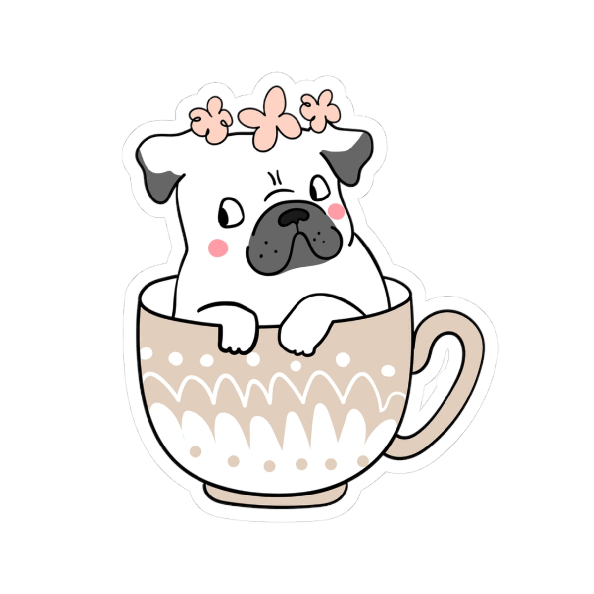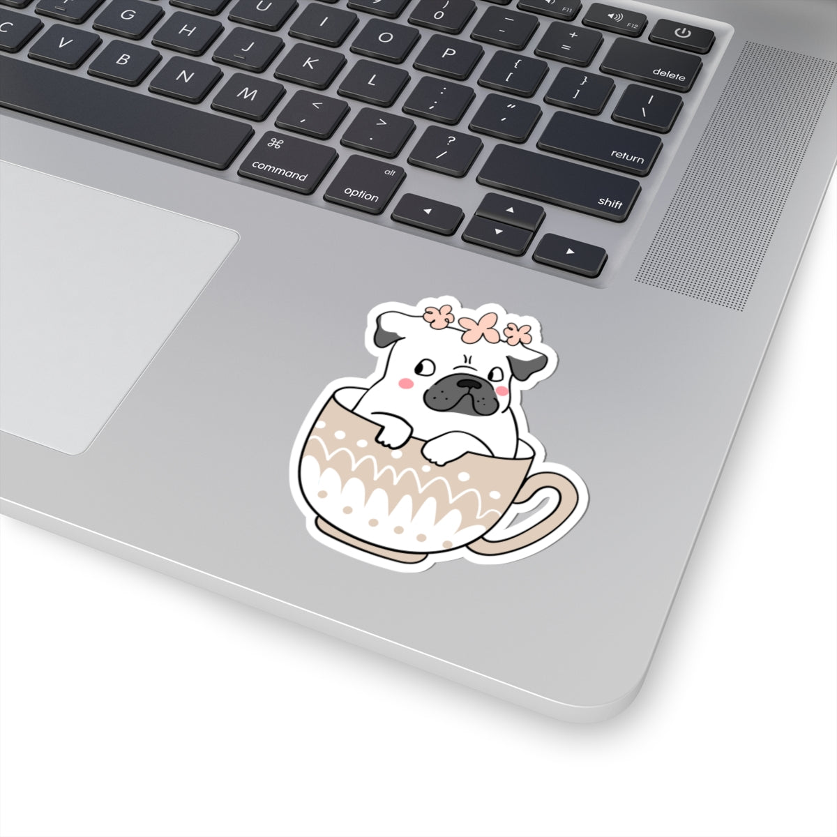 Cute Pug in Cup Stickers, Adorable Pet Decor, Dog Lover Gifts, Laptop Decals, Flower Crown Pug Art